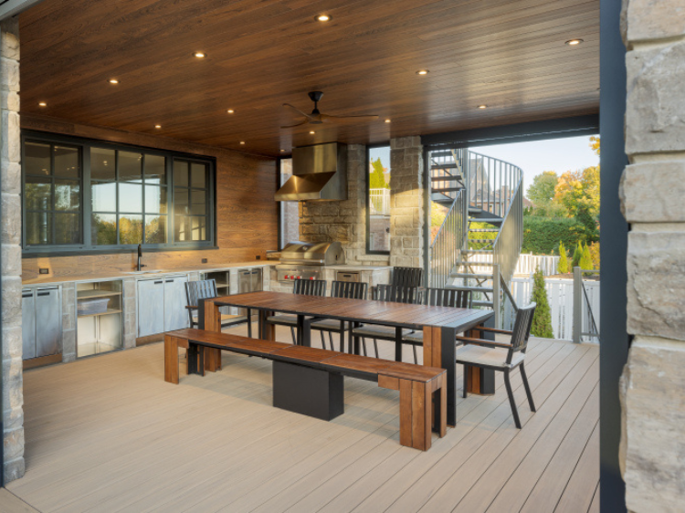 Au cœur de cette résidence, la cuisine incarne à la fois le soin porté aux parcours quotidiens et l’intention d’un design fonctionnel et chaleureux. Positionnée au rez-de-chaussée dans un axe stratégique, elle bénéficie d’un accès direct au garde-manger, à la salle à manger et à la terrasse extérieure avec cuisine intégrée. Chaque détail a été pensé selon les habitudes des occupants, notamment l’ergonomie adaptée aux tailles contrastées des adultes, l’implantation de rangements spécialisés et le dégagement visuel des surfaces de travail. Un îlot central généreux, une palette sobre rehaussée de bleu profond et des matières naturelles confèrent à la cuisine une identité forte, apaisante et raffinée. L’intégration harmonieuse des équipements, la planification de l’éclairage en plusieurs niveaux et les modules sur mesure permettent à cet espace de se transformer au fil des moments de la journée, tout en conservant sa lisibilité et sa simplicité d’usage. Plus qu’un lieu fonctionnel, la cuisine de la Maison Orée-des-Bois devient un véritable carrefour familial, conjuguant intelligence spatiale et qualité de vie.